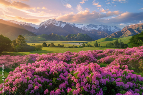 A breathtaking landscape at sunset featuring a field of vibrant pink flowers with majestic snow-capped mountains and lush green hills in the background