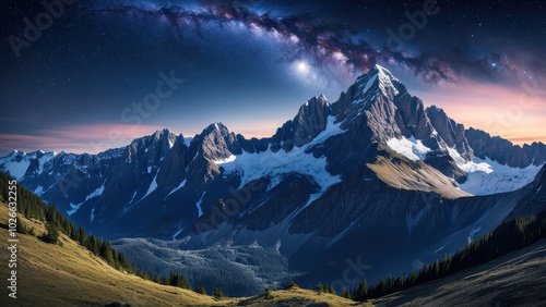 A breathtaking mountain landscape under a starry sky with the Milky Way visible.