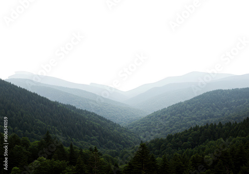 A breathtaking panoramic view of rolling green mountains and deep valleys shrouded in a soft, ethereal mist under an overcast sky isolated on transparent background
