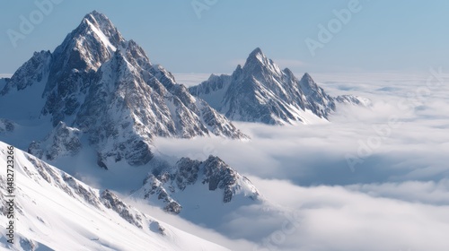 A breathtaking panoramic view of the towering snow covered mountain peaks piercing through the ethereal clouds creating a serene and landscape