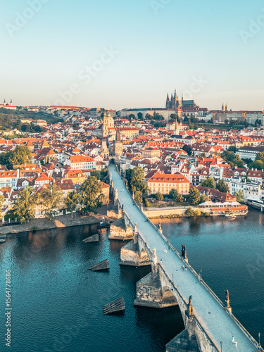A breathtaking sunrise illuminates the skyline of Prague, showcasing the historic Charles Bridge and the grandeur of Hradcany Castle reflecting on the Vltava River.