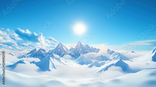 A breathtaking view of a mountain range covered in pristine snow, with bright winter sunshine and a crisp blue sky above.
