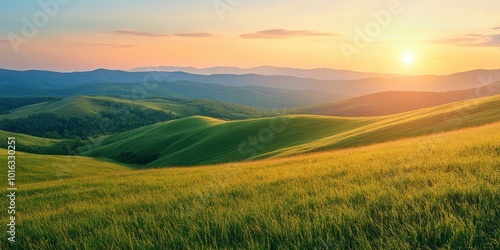 A breathtaking view of rolling hills bathed in golden sunlight, highlighting nature's beauty at sunrise.