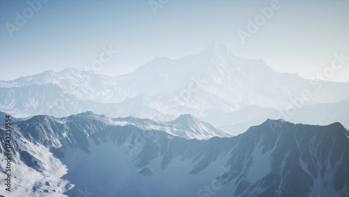 A breathtaking view showcases snow draped mountains reaching toward a clear sky. The sunlight casts a soft glow on the peaks, highlighting their grandeur and rugged beauty.