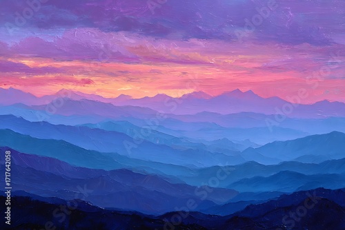 A breathtaking vista of layered mountains, bathed in a soft gradient of vibrant purples, pinks, and blues at sunrise or sunset.
