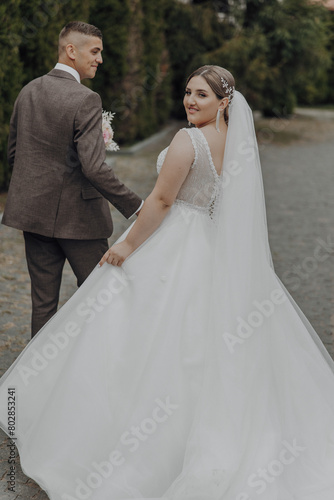 A bride and groom are walking down a path in a wedding dress and suit. The bride is holding a bouquet and the groom is holding her hand