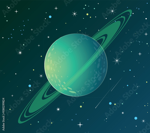 A bright green planet with radiant rings, which impresses with the saturation and freshness of colors