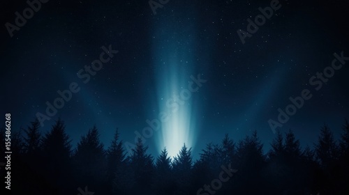 A bright, light beam ascends above a dark forest at night
