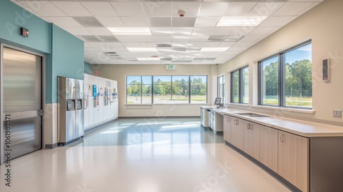 A bright, modern interior of a healthcare facility with large windows and functional spaces.