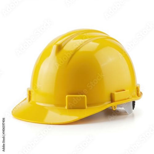A bright yellow hard hat sitting upright on a plain surface view isolated on white background