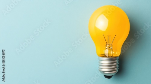 A bright yellow light bulb on a light blue background, symbolizing ideas, creativity, and illumination.
