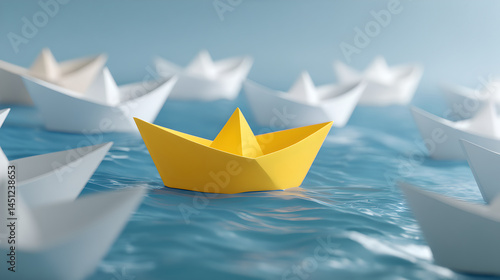 A bright yellow origami boat sails on a calm, blue sea, surrounded by white paper boats, symbolizing leadership and standing out.