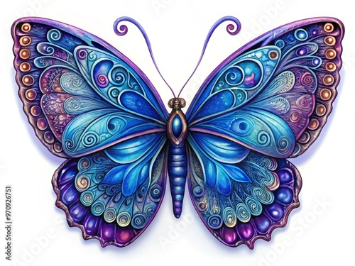 A brightly colored butterfly boasts iridescent blue and purple wings, adorned with intricate patterns and delicate antennae, its beauty is mesmerizing.