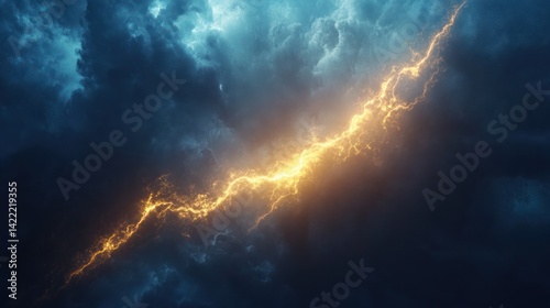 A brilliant golden lightning bolt erupts through stormy dark clouds