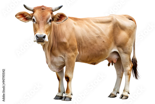 A brown cow standing in a side profile with a calm expression, its muscular frame highlighted against a transparent background