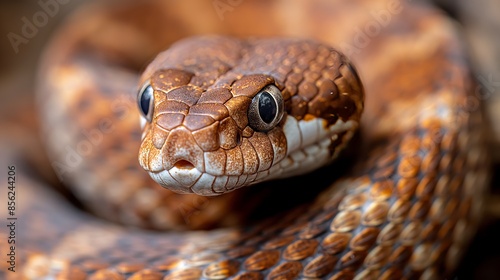 A brown house snake with intricate scale patterns and piercing eyes coiled and poised.