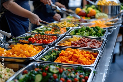 A buffet table with a variety of fruits and vegetables. The table is set up for a party or gathering