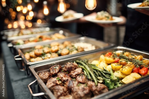 A buffet with assorted grilled meats, vegetables, and roasted potatoes served in chafing dishes under warm lighting.