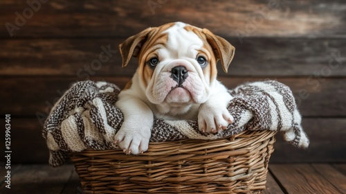 A bulldog puppy sitting in a wicker basket with a soft blanket.