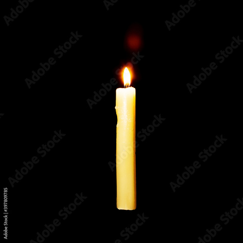 A burning candle hangs in the air against a black background.