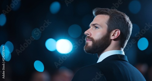 A business leader giving a speech at a conference with an audience and a large screen backdrop