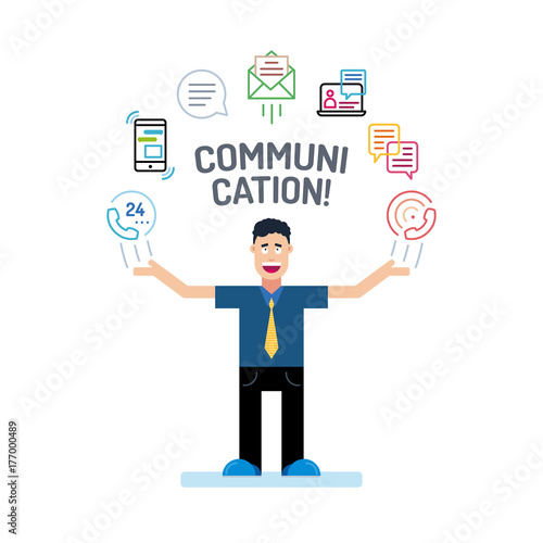 a business man character in blue tees and tie with his hands up. communication Icons are arranged in a semicircle above the head