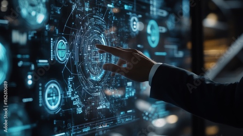 A business professional in a suit, with an outstretched hand pressing a transparent, futuristic digital interface. the interface includes various icons, graphs, and network connections, symbolizing da