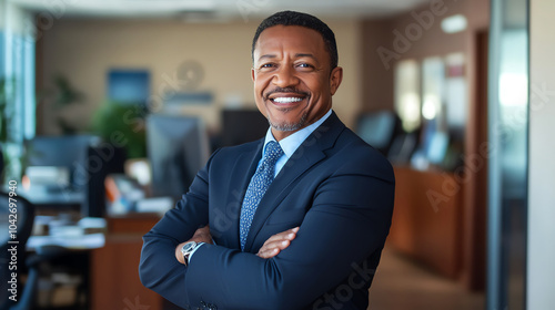 A businessman, arms folded, smiling confidently in a formal office space.