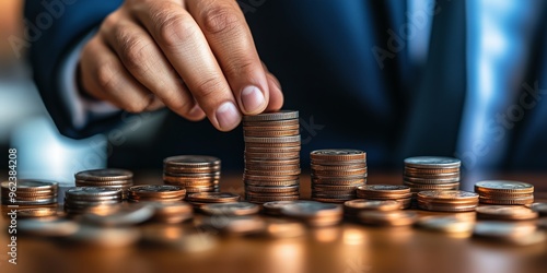 A businessman carefully stacking golden coins, symbolizing financial growth, investment strategies, and wealth accumulation.