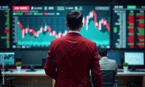 A businessman in a red suit analyzing fluctuating stock market graphs on multiple monitors. A modern depiction of finance, investment, and data-driven decision-making