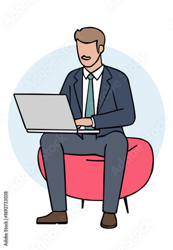 A businessman in a suit and tie is sitting on a red beanbag chair, working on a laptop. He appears focused and relaxed, representing modern, flexible work environments and technology use.
