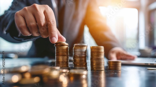 A businessman in a suit carefully stacks golden coins, symbolizing financial growth, wealth management, and investment. Sunlight shines through, adding warmth to this concept of prosperity
