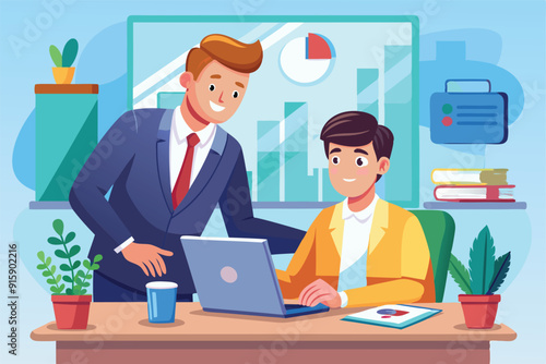 A businessman is offering support to a colleague during a focused meeting, showcasing collaboration in a contemporary office environment