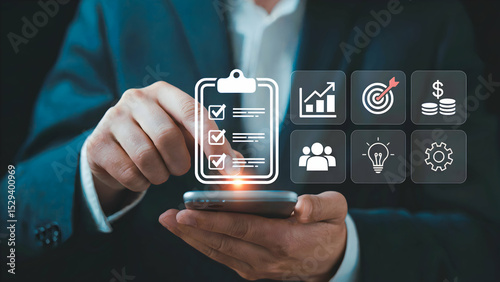 A businessman uses a smartphone to manage tasks, track progress toward goals, analyze data, and strategize business growth, showcasing effective project management and mobile technology.