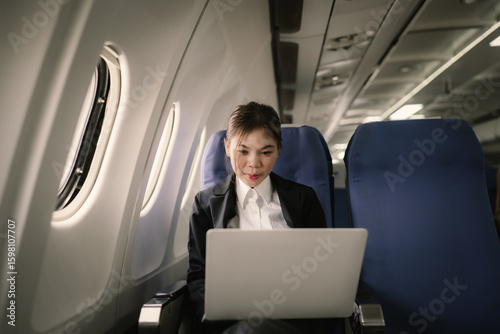 A businesswoman sits in an airplane seat working on a laptop, focused and productive during her flight, making use of travel time efficiently and professionally