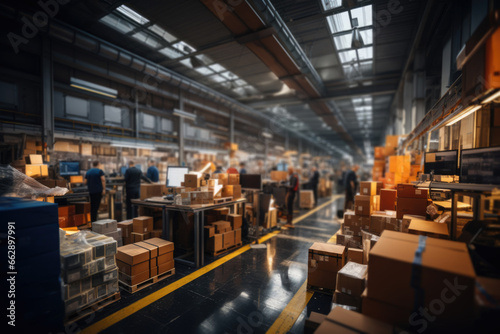 A busy distribution center with workers efficiently sorting and packing goods for shipment, showcasing the importance of streamlined logistics. Concept of efficient distribution. Generative Ai.