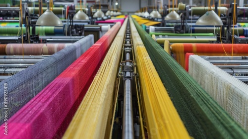 A busy textile manufacturing plant with rows of automated looms producing fabrics in various colors and patterns, Textile factory scene, Fabric production style