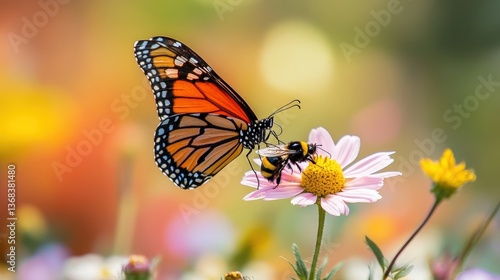 A butterfly and a bee sharing a flower, showcasing the beauty of nature's harmony