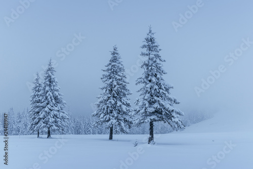 A calm winter scene. Firs covered with snow stand in a fog. Beautiful scenery on the edge of the forest. Happy New Year
