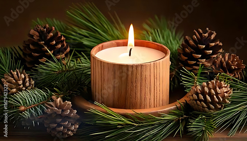 A candle burning in a wooden holder, surrounded by pine needles and pine cones, Christmas
