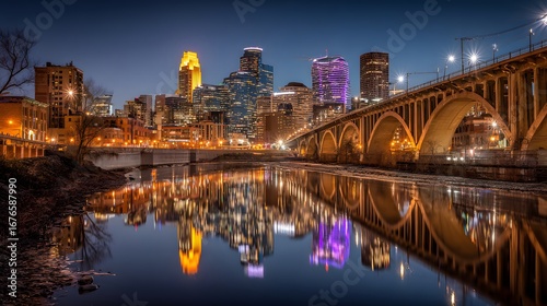 A captivating cityscape at night, showcasing Minneapolis's illuminated skyline reflected serenely in the still water, with an impressive bridge arching over the river.