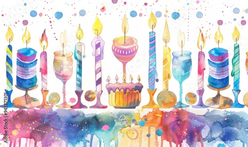 A captivating digital illustration showcases a colorful arrangement of Chanukah candles and a menorah, radiating festive warmth and joy. The watercolor style enhances the festive spirit beautifully