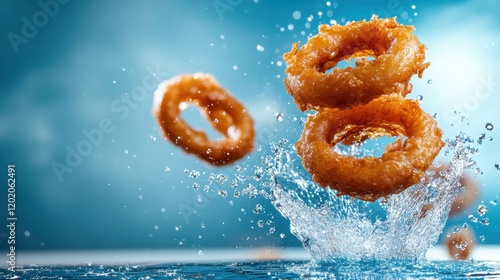 A captivating image of golden-brown onion rings splashing into water, creating an eye-catching scene that highlights their crispiness and the refreshing nature of food.