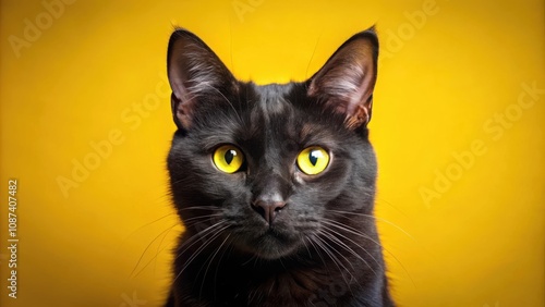 A captivating portrait of a black feline with piercing yellow eyes, set against a vibrant yellow background.