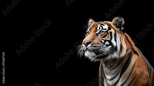A captivating portrait of a Sumatran tiger, its striking orange and black stripes stand out against a dark background. The tiger's intense gaze and powerful presence evoke strength, beauty, and wildne