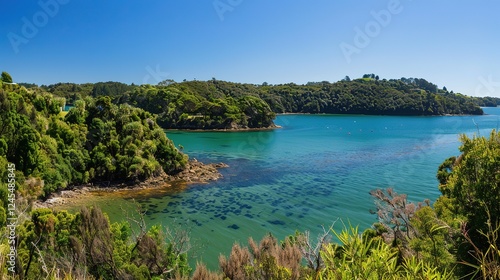 A captivating scenic coastal lagoon embraced by lush green cliffs and filled with crystal clear water. The lagoon presents a harmonious blend of natural beauty, with the verdant cliffs and transparent