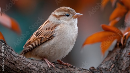 A captivating sparrow portrait perched on a branch with warm autumn foliage