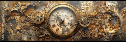A captivating steampunk-inspired mechanical clock, its intricate gears and cogs symbolize time, precision, and the ingenuity of mechanical artistry.