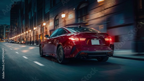 A car is driving down a road in a city at night. The car is a sports car with a sleek design and a shiny black color. The city is lit up with bright lights, creating a vibrant and energetic atmosphere