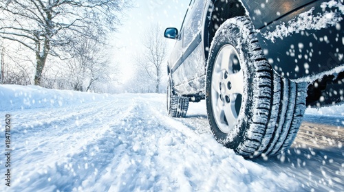 A car is parked on a snow-covered road, surrounded by trees. Snow falls gently, illuminated by warm sunlight in the distance